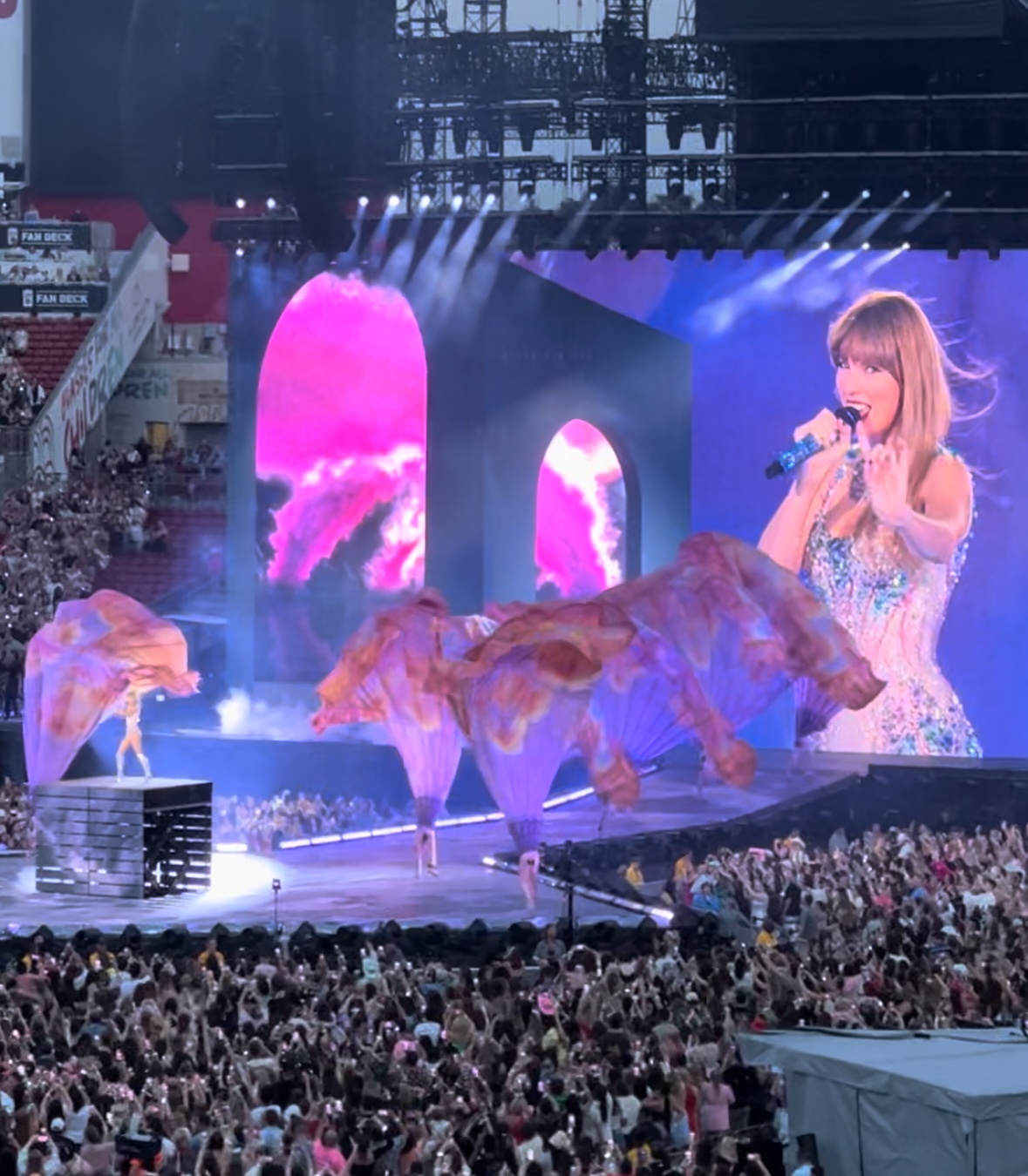 Taylor went on stage 13 minutes early. I’m still not sure why, but I’ve heard stories of fellow fans who had to bolt over to their seats when “Applause” came on. Before then, we traded bracelets, took tons of pictures and bonded with fellow Swifties before splitting up to catch Gracie Abrams. She sang beautifully and the “Free Now” bridge has been on repeat in my head. The “Debutation” mashup caused us all to “clown” over when she will release the rest of the re-recordings. TTPD live was ethereal. There’s no other way to put it.